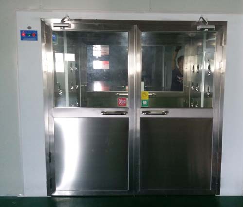 手動門貨淋室是經過高效過濾器與初效過濾器兩級過濾器過濾后潔凈氣流由可旋轉噴嘴從各個方向噴射至物體表面,有效而迅速清除塵埃粒子,帶有塵埃粒子的空氣再由初效過濾器、高效過濾器過濾后重新循環到風淋區域。手動雙門貨淋室是“對貨物進行吹淋的風淋室,簡稱貨淋室、貨物吹淋室”。