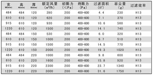 紙隔板高效過濾器規格尺寸及其它參數: