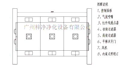 ,污染微粒就經(jīng)高效過濾的高潔凈度潔凈空氣射掉,25m/s以上的高風(fēng)速確保了有效的噴射和漂移微粒經(jīng)過粗高兩級(jí)過濾器基本過濾掉。